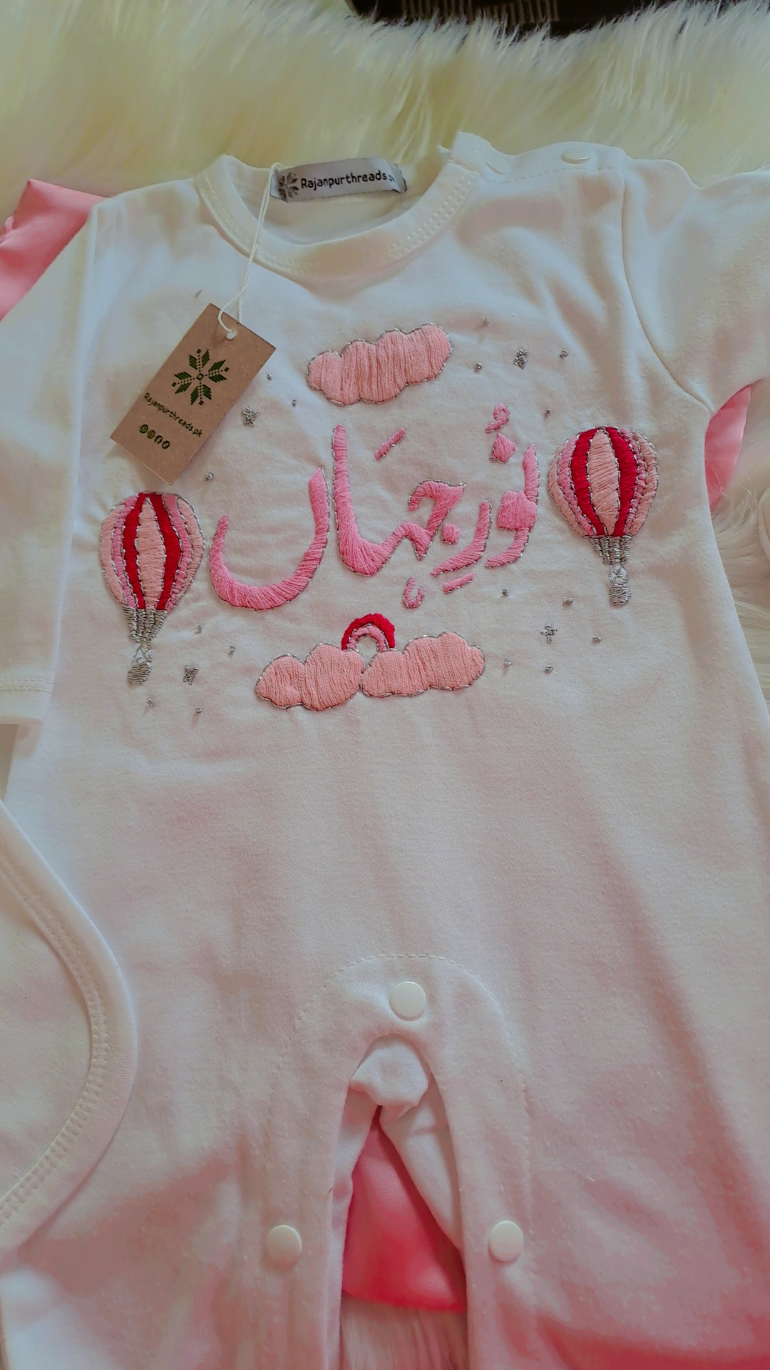 - Hand-Embroidered Romper: Adorable romper with customized name and hot air balloon design