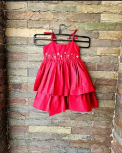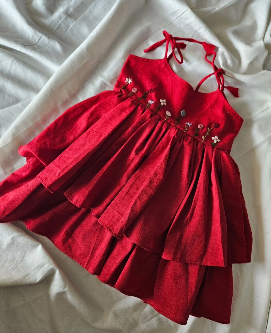 “A charming red frock with delicate hand-embroidered floral details and soft layered tiers — crafted for timeless elegance and comfort.”