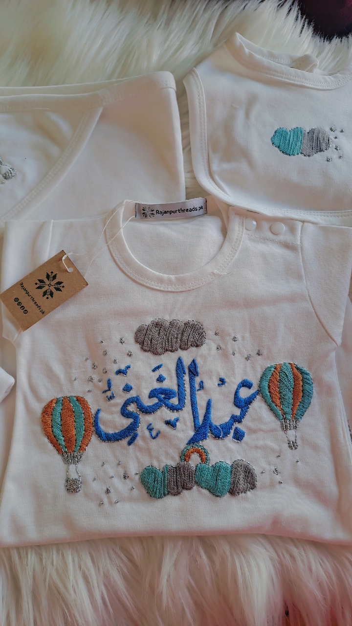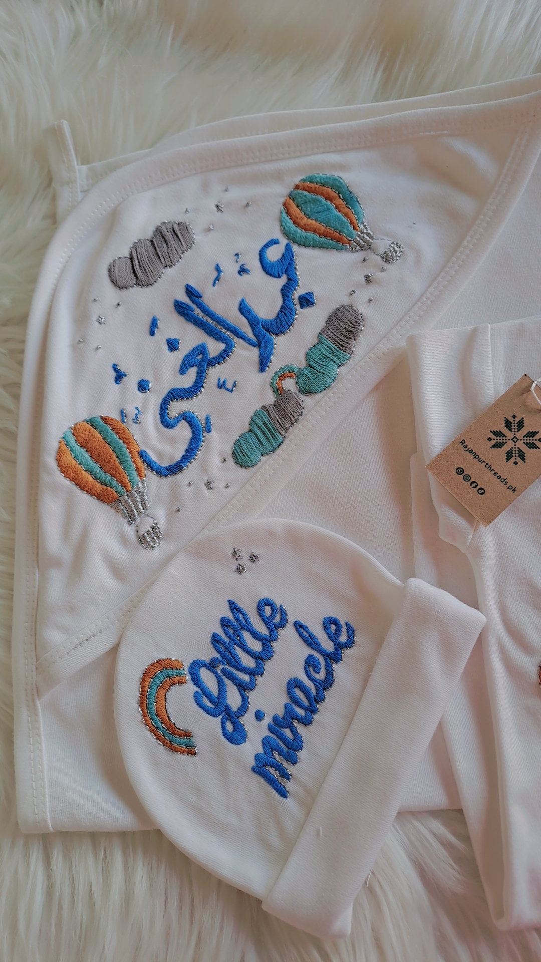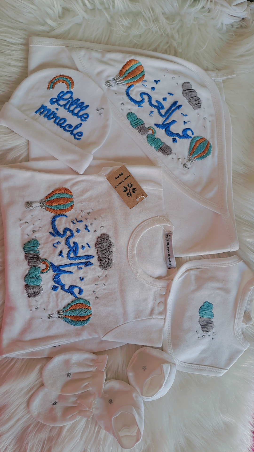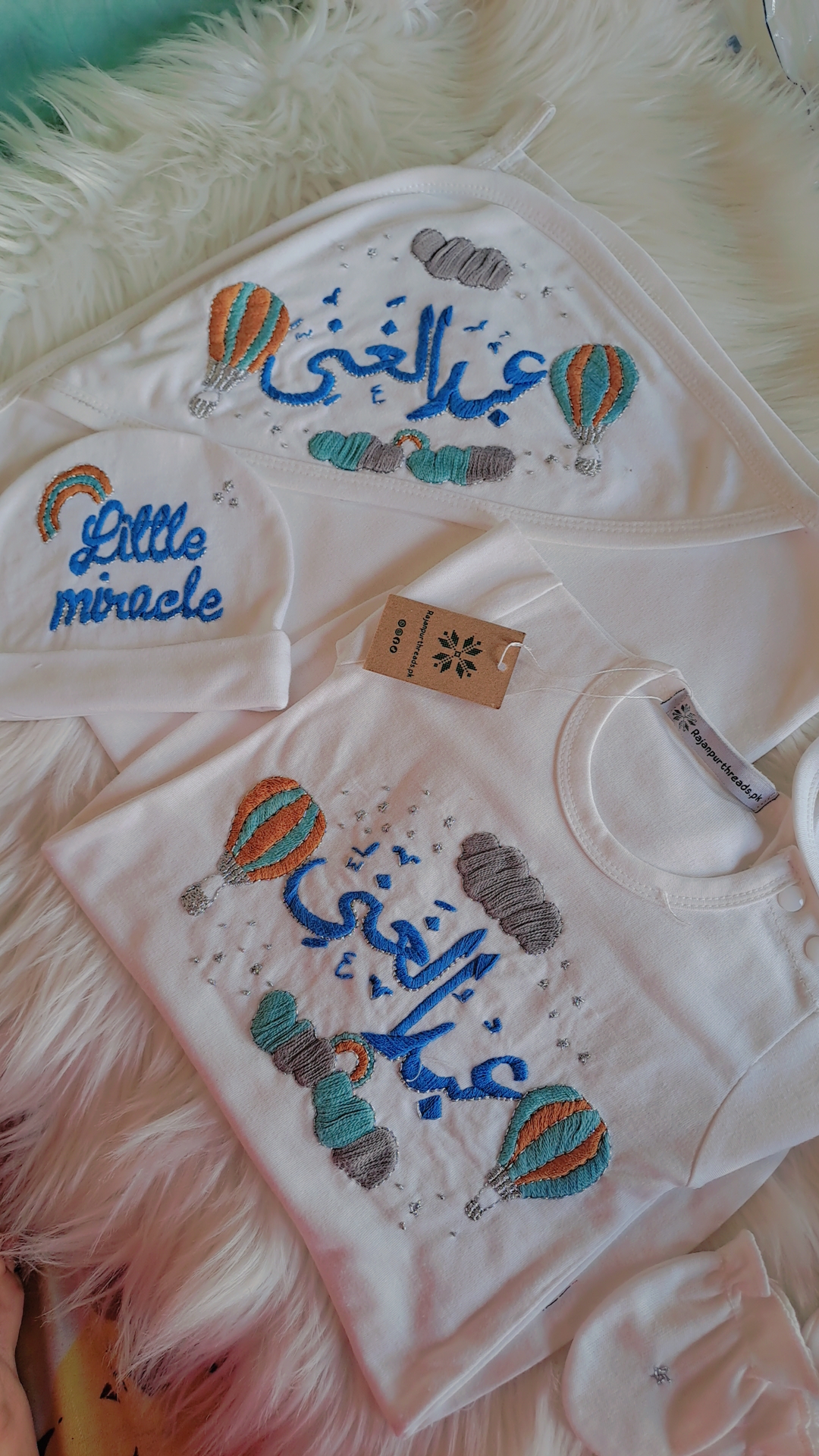 Elevate your little one’s style with our exquisite hand-embroidered starter pack, featuring a hot air balloon theme!