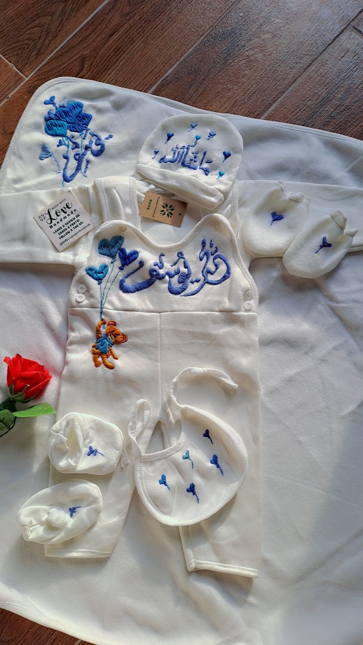 It includes a dungaree-style romper, cap, bib, mittens, booties, and a wrapping sheet – each piece beautifully embroidered with the name Yousaf for a personal touch. The delicate detailing, combined with the soft fabric, makes this outfit not just clothing but a keepsake to treasure.