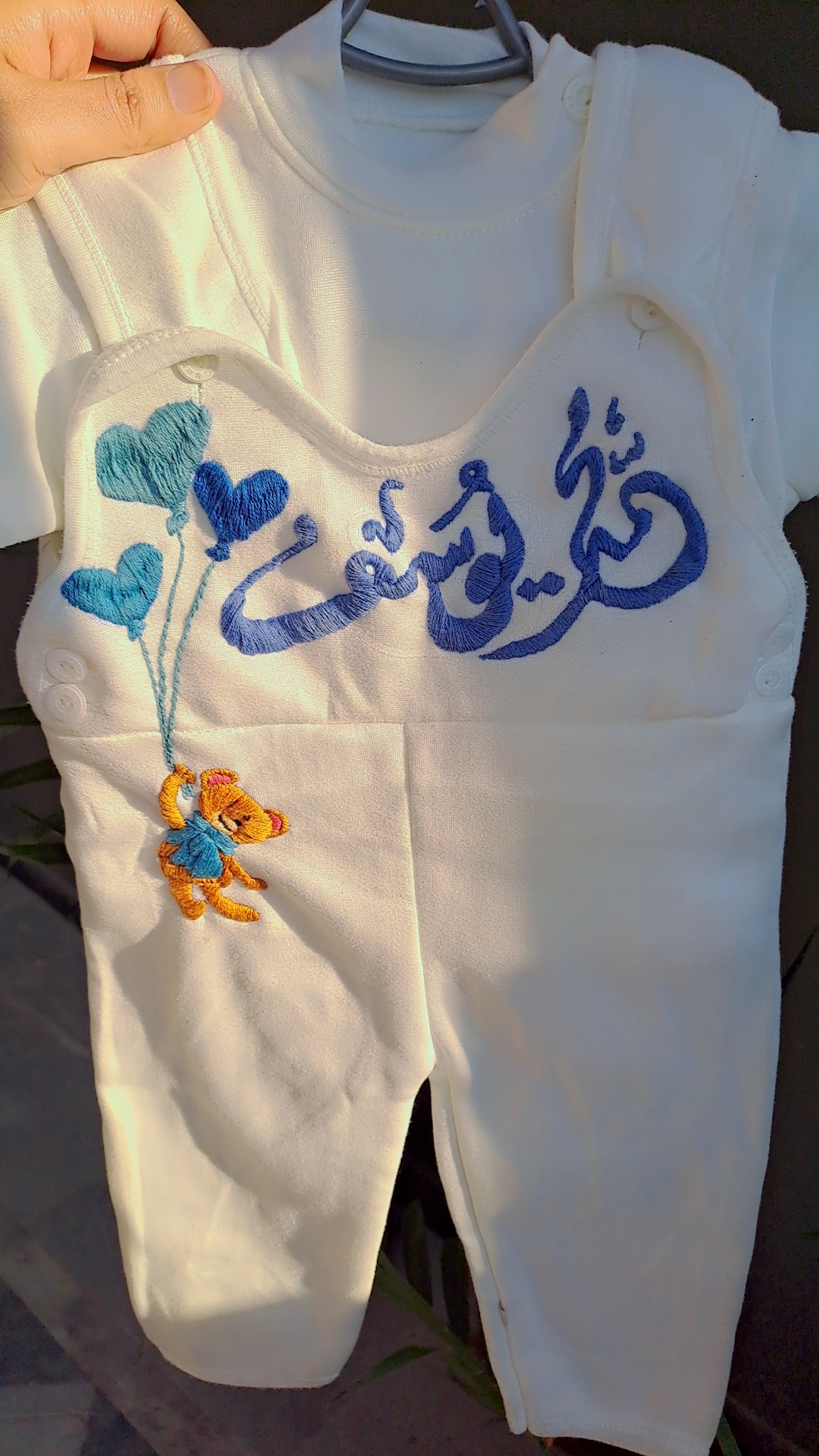 Soft fleece, sweet embroidery – a customised baby set for little Yousaf, made with love by RajanpurThreads.pk.”
